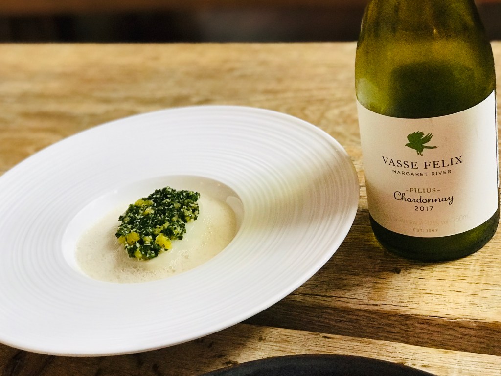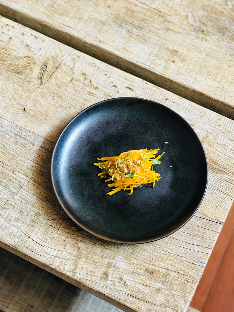 Chef Constant 的母親也是廚師,當年在香港做的是最傳統的粵菜料理,工作之餘自然也做飯給孩子吃,所以主廚從小記憶的中式蒸魚和南瓜豬肉都在這一季排入菜單。主餐四選一中,chef Constant 不斷自建得吃吃這道鱈魚,因為在油脂細膩豐富的圓鱈上,他特意以薑末、蔥末、柳橙碎增味,再以焦化魚露奶油醬提出鹹鮮味,重點是一入口,完全是家常清蒸魚的味覺記憶,就像前幾道南瓜豬肉也是主廚的家常味。