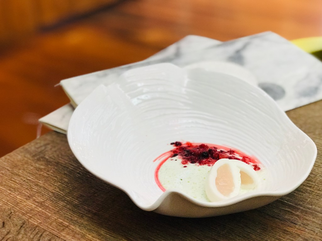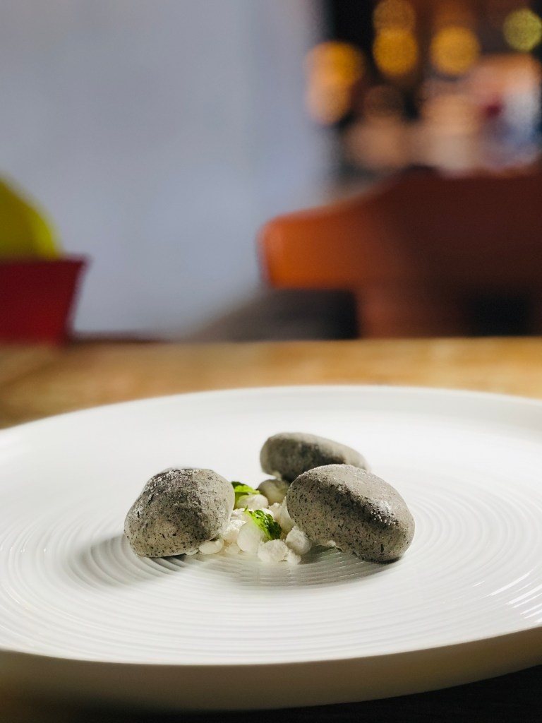 在 amuse bouche 之後上桌的是一整碗「石頭」,有黑有白,延續 chef Constant 在 JE kitchen 時期討論度很高的一道菜式,以海鮮高湯和牛奶包覆生食鹽漬干貝,軟軟嫩嫩,這一季秋天搭配莓果冰沙襯托,滋味清甜,再現西班牙餐廳〈Mugaritz〉主廚 Andoni Luis Aduriz 的作品,頗有像經典致敬的味道, chef Constant 再加強力道前後呼應,秋季菜單收尾的甜點端上「石頭 2.0」,以伯爵紅茶粉末加上稻草炭粉包覆蘋果白蘭地慕斯,幾可亂真。