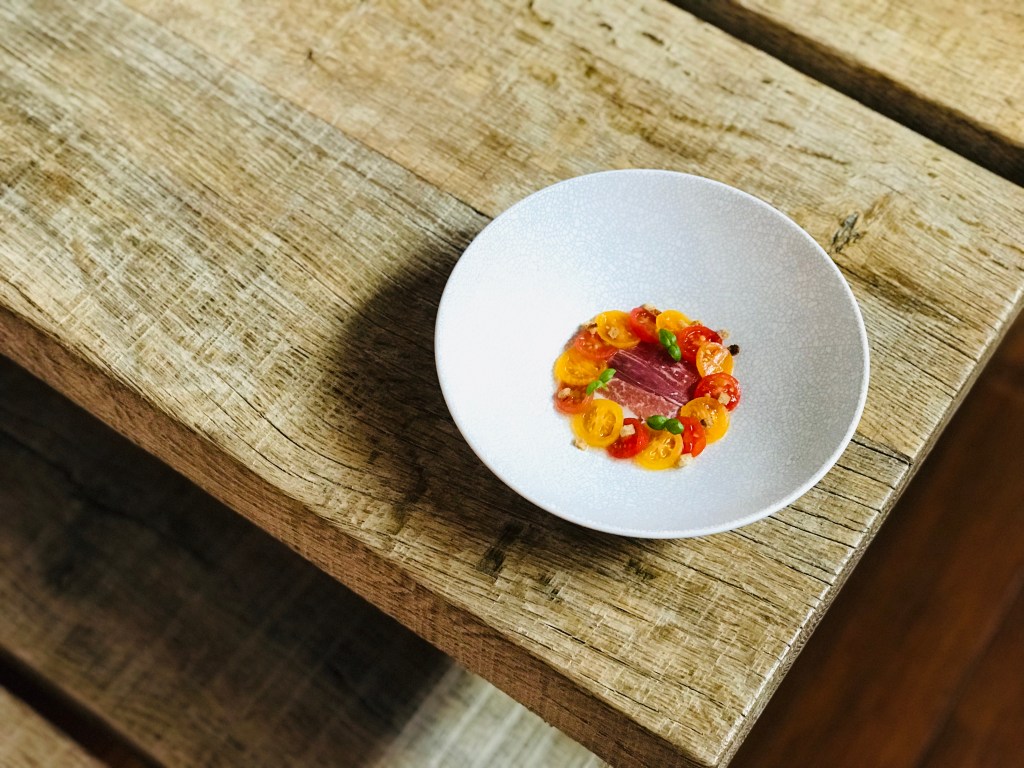 緊接著上桌「番茄 柴魚 伊比利火腿」是很得人心的清爽小品,取柴魚高湯的鮮、伊比利火腿的鹹、小番茄的甜,明明是冷盤卻入口溫潤,必須說,S餐廳的木頭桌椅搭配自然採光,「相機先食」讓照片神美!