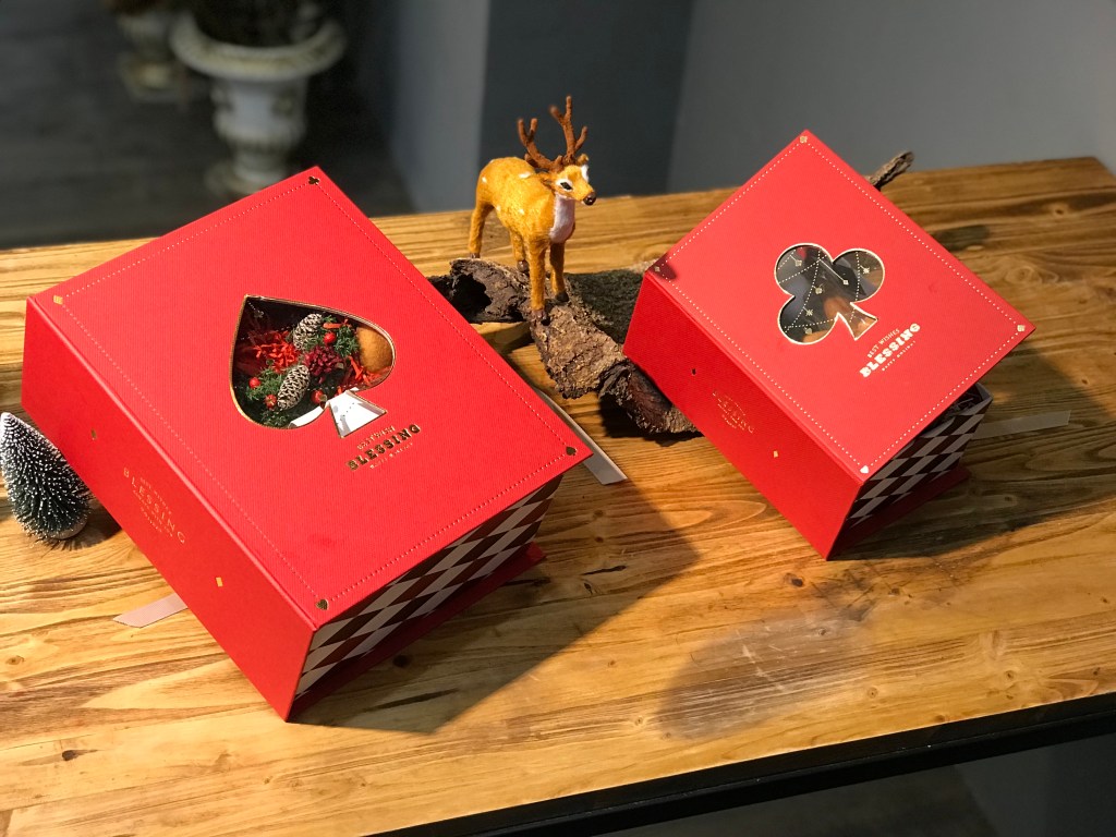 前台視新聞、三立新聞主播李宛儒成立、開幕即將滿一年的「居樂堂甜舖」,2019「聖誕花禮盒」限量上市,甜點跟花禮一次滿足。今年主題是「夢與撲克」,禮盒包裝外型精選撲克牌的黑桃以及梅花圖樣,分別代表和平以及幸運,因為撲克牌在歐洲古代占卜意義中,黑桃代表橄欖葉,梅花則是代表酢醬草(三葉草),都是對於收到禮盒的消費者,最棒的祝福。