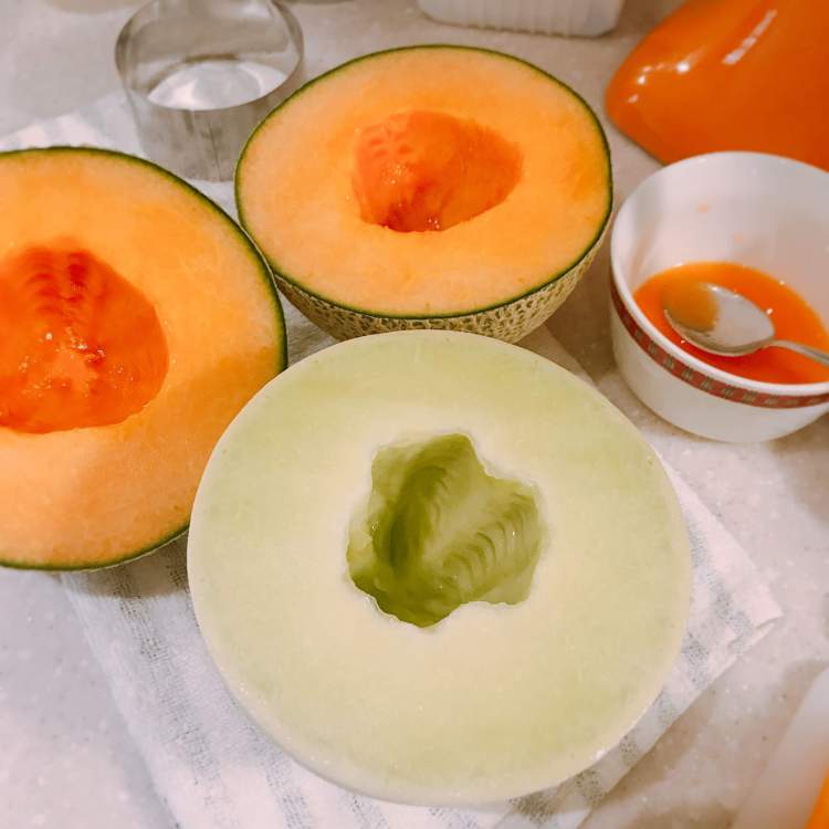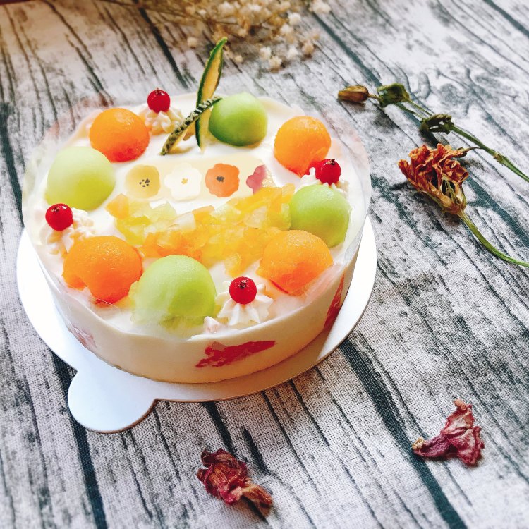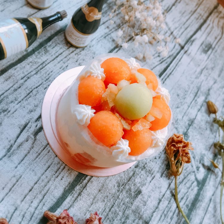 第一次製作這款蛋糕的時候,是旗下品牌 居樂堂 忠實顧客指定的時令水果,我自動加碼採購兩款雙色哈密瓜(親自逛市場的好處!找到當季水果!)香氣更有層次之外,配色也豐富,加上哈密瓜是一款多汁水果,挖取裝飾用的果肉,就能搜集足夠量的新鮮果汁,做為拌入鮮奶油的提味風味。