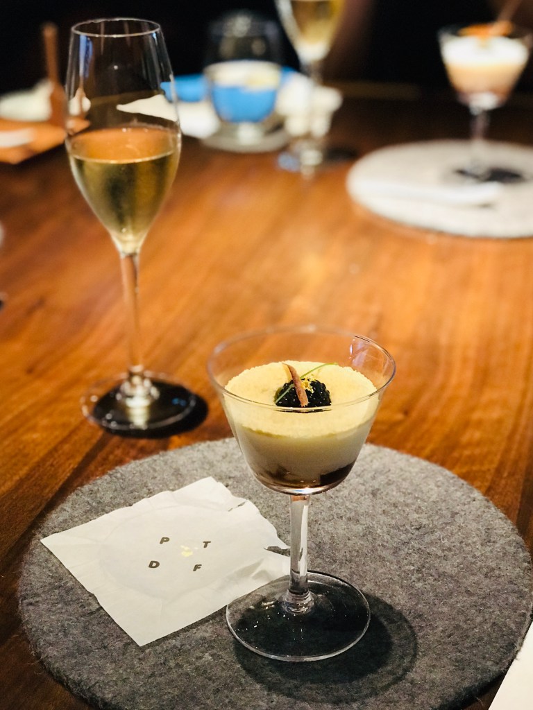 入席,安安靜靜什麼也先別說,欣賞桌上彷彿縮小版睡蓮的兩片綠葉吧!就是那一把給小青蛙擋雨的葉,是今日將入口的金蓮,上頭水珠欲落而不滴,春雨剛過、冰雪漸融,心有此想的同時,送上一杯以綠草莓汁為底的乳白果汁凍,杯緣小心翼翼擺上綠草莓接骨木奶酪塔,撒上帶有草本味的松針,優雅盛一勺小碎冰sobert和松針油,這是曾下冰霰的山脊、枝頭冒新芽,一種很4D的情境概念。