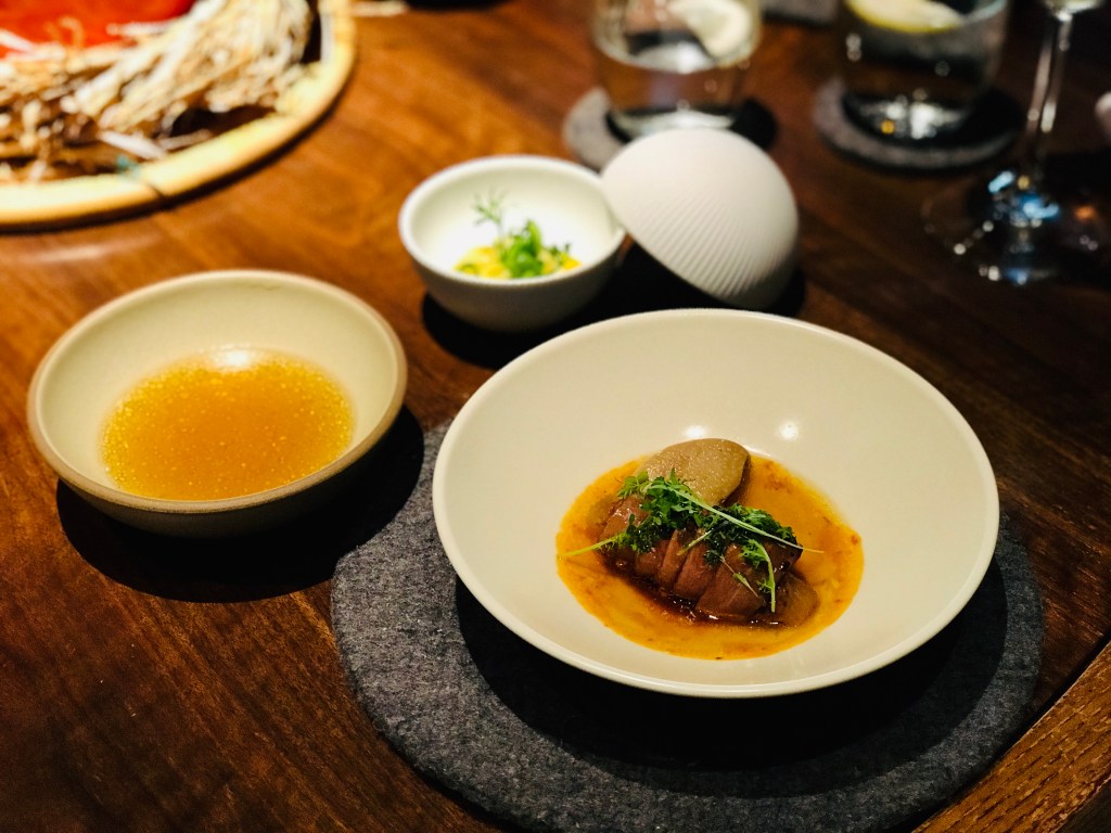 冬春之際,傳統市場開始擺出「娃娃菜」,長相幽默而且有點張牙五爪,是很嫩的芥菜,口感近似菜心,入口帶點微苦卻回甘,RAW 以松露奶油、芝麻醬和胡桃的油脂緩解蔬菜餘苦,增添溫潤口感,太好吃了,一旁裹上醬汁的三顆「台版Gnocchi」以湯圓呈現,立體的菜搭上質樸灰白的寬口盤,選的真好,畫面協調雅緻。