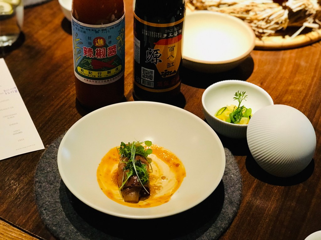 驚蟄之後,農家播種,小時候我會跟著爺爺「巡田」,種蔬菜的時候,他總得出一項神聖任務,認真梳理菜圃,必須拔除播種太密集或長太擠的蔬菜,這可是農家私藏好菜,當晚上桌會有各式嫩菜,就像這盤青蔬有一種農家梳理菜園過後的熱鬧,近三十種各式嫩芽好菜統統上盤,入口是田園的活力與來年的期待,盤底畫龍點睛的蠔醬和嫩薑味,輔以紫蘇、花椒、昆布熟成過的黑侯以及白腹青花魚,油脂豐潤而清新爽脆。